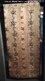 • Tiene un paño de hombros. Tejido de posible manufactura francesa, confección local. Ultimo tercio del siglo XVIII. Tejido labrado de seda. Fleco metálico. Mide 214 x 48 cm.